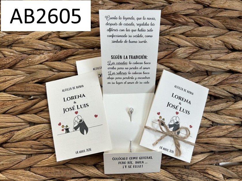 Sorprende a tus invitados con estos originales alfileres de novia clásico con leyenda. Una tradición adaptada a nuestros días.